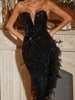 Embrace elegance with the Krzoo Strapless Feather Sequin High-Waist Irregular Long Dress. This exquisite sequin gown combines luxurious materials and intricate design elements. making it a perfect choice for those seeking a sophisticated and unique look.