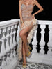 This strapless long dress features a high-waist design with an irregular skirt hem. adding a touch of modern flair to a classic silhouette. The solid color base is elegantly enhanced with feather accents and shimmering sequins. creating a captivating look. The deep V sheer mesh and backless design. complemented by a lace-up detail and zipper closure. offer both allure and functionality. Available in champagne. dark green. and black. and in sizes ranging from S to XXXL. this dress is tailored for those who appreciate refined elegance.